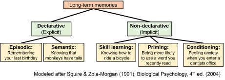 Pictured above is a common human long-term memory taxonomy that suggests separable memory systems. Declarative memories are memories that we know that we can tell others; non-declarative memories we know by doing. Nonhuman animals cannot verbally report about their knowledge-base or past experiences, so the extent to which animals have declarative memories systems is debated. However, comparative cognition researchers use unique cognitive behavioral methodologies to determine if nonhuman animals exhibit functional parallels to memory systems that we know exist in humans.